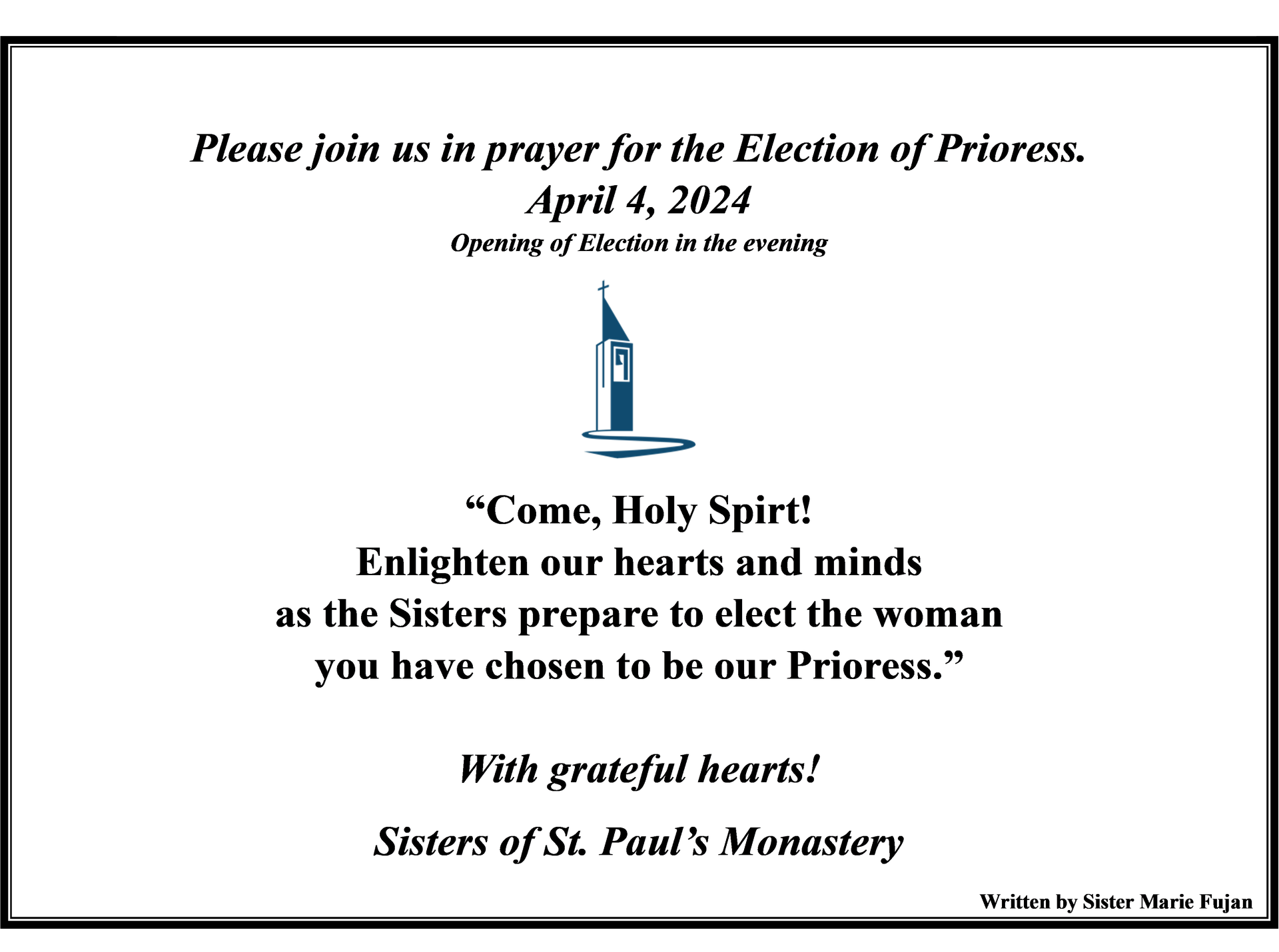 Solemn silence will be observed on Thursday, April 4th, until after the evening meal when the Canonical Election of Prioress begins in the chapel. This process of prayer, reflection, and discernment will continue until one of the sisters is officially elected to serve the Sisters of St. Benedict of St. Paul’s Monastery as Prioress until 2029. In the meantime, we invite each of you to hold the Sisters of St. Paul’s Monastery in prayer, that they may be enlightened by the Holy Spirit during this special time of discernment.