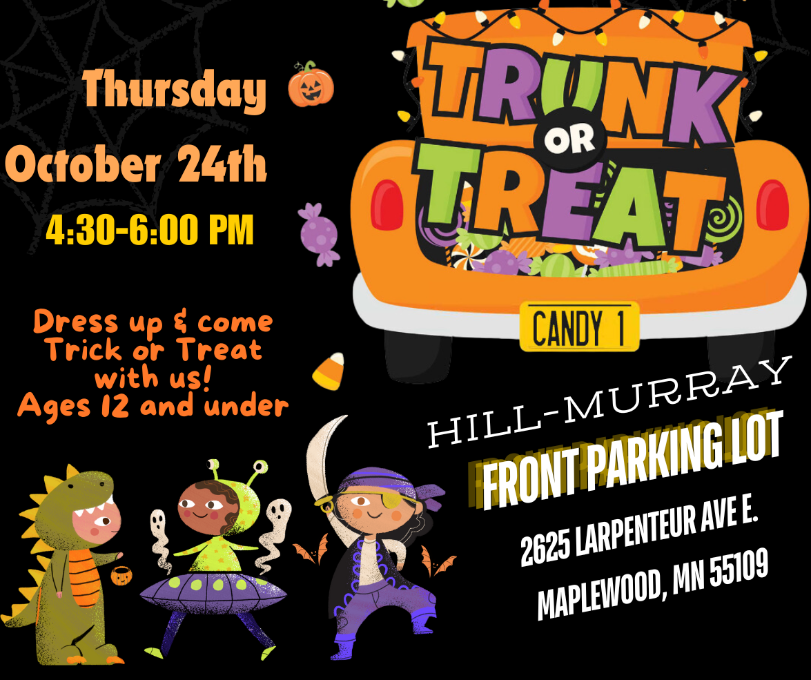 All are invited to bring their kids to the 4th Annual Trunk or Treat event on Thursday, October 24th, from 4:30 – 6:00 PM. It is hosted by our Hill-Murray students and is a great evening for kids (12 and under). If you want to host a Trunk, set up is at 4:00 PM in the front parking lot!
